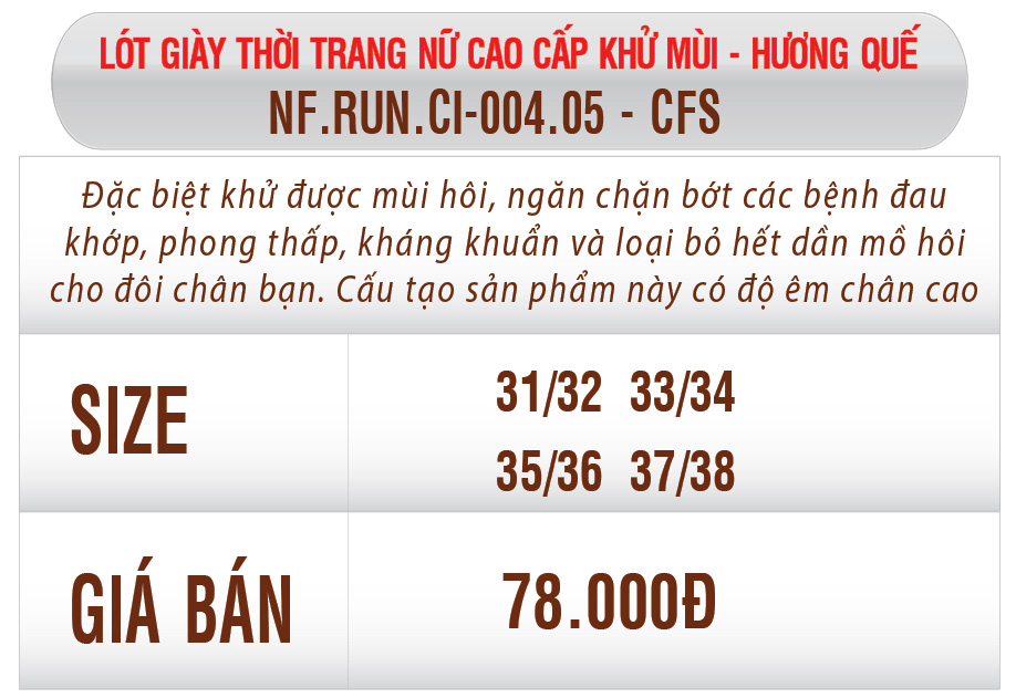 Dòng sản phẩmLót giày NF cho NữLót giày khử mùi hương Quế NFLÓT GIÀY KHỬ MÙI CAO CẤP HƯƠNG QUẾ NỮ- CFS